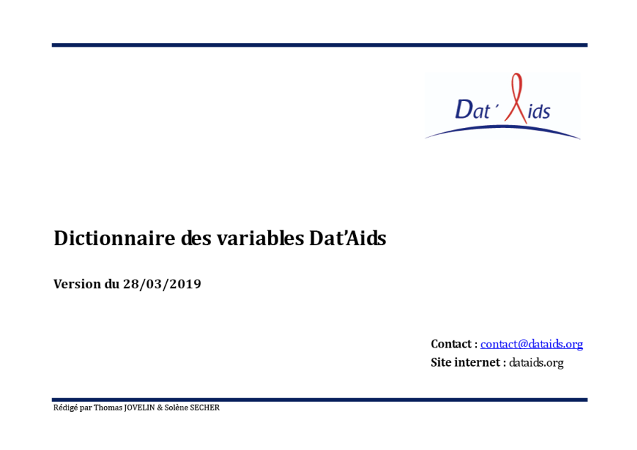 Dictionnaire des variables des tables Dat'Aids. Libellé, définition, format.